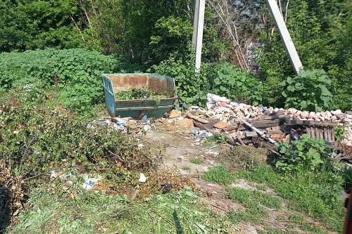 Подъезд к бункеру для крупногабарита завален кирпичами и ветками, а пластиковый контейнер нагружен бетоном настолько, что его невозможно опустошить, не сломав.